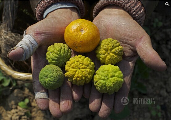 湖南省常德市桃源縣盤(pán)塘鎮(zhèn)、陬市鎮(zhèn)、架橋鄉(xiāng)等地地處丘陵地帶,曾是生態(tài)環(huán)境優(yōu)美的地方。2001年,占地2450畝的晟通集團(tuán)常德產(chǎn)業(yè)園(創(chuàng)元鋁業(yè))開(kāi)工建設(shè),鋁產(chǎn)品粗加工等高污染高能耗項(xiàng)目陸續(xù)上馬。產(chǎn)業(yè)園邊建設(shè)、邊生產(chǎn)、邊治污,給當(dāng)?shù)厣鷳B(tài)環(huán)境帶來(lái)難以挽回的創(chuàng)傷,一些在此世代生息的農(nóng)民背井離鄉(xiāng),成為環(huán)境移民。圖片拍攝于2014年11月18日,衛(wèi)生防護(hù)區(qū)內(nèi)生長(zhǎng)的枳殼因?yàn)樵獾轿廴荆ㄖ虚g為正常的橘子),外形已經(jīng)發(fā)生了明顯變化。陳杰/攝影 新京報(bào) 騰訊圖片聯(lián)合報(bào)道