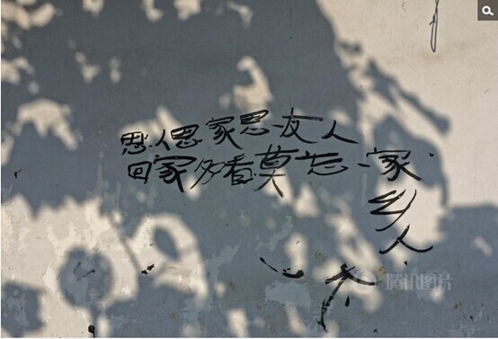 在靠近電解鋁廠廠房圍墻外不遠(yuǎn)一些居民已經(jīng)搬走,在一戶農(nóng)家的墻壁上,留下告別者思鄉(xiāng)的心情。如今,這里被污染包圍,已經(jīng)無(wú)法在此生活下去了,不得不離開(kāi)。